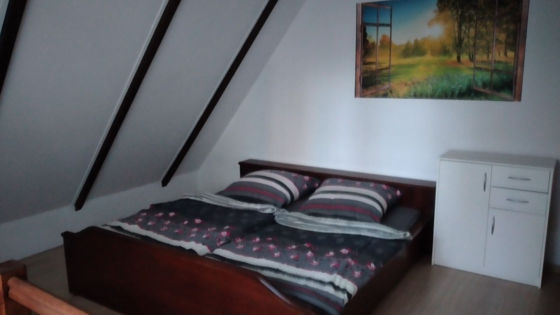 na piętrze, ze skośnym dachem, łożem małżeńskim i dostawką